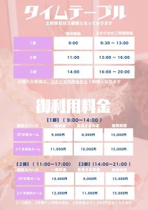 受付開始9:00/スタジオの利用9:00~13:00/お帰りの準備13:00~14:00